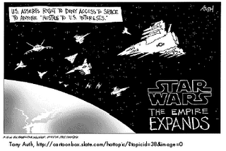 "The Bush administration has staked an aggressive new claim to dominate space - rejecting any new treaties that seek to limit the United States' extraterrestrial activities and warning that it will oppose any nations that try to get in its way."